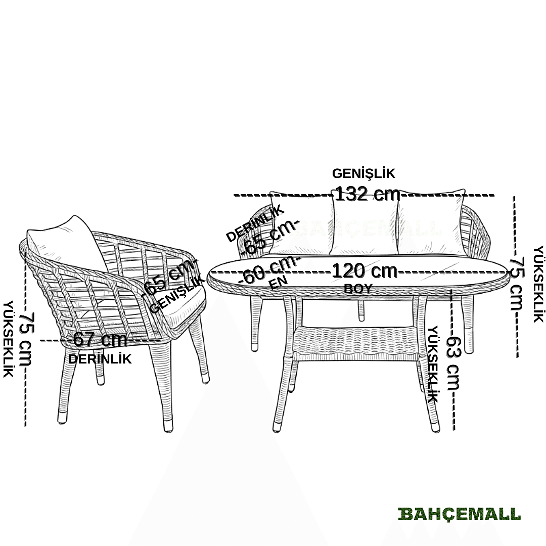 - 2'li Koltuk: Genişlik 132 x Derinlik 65 x Yükseklik 75 cm