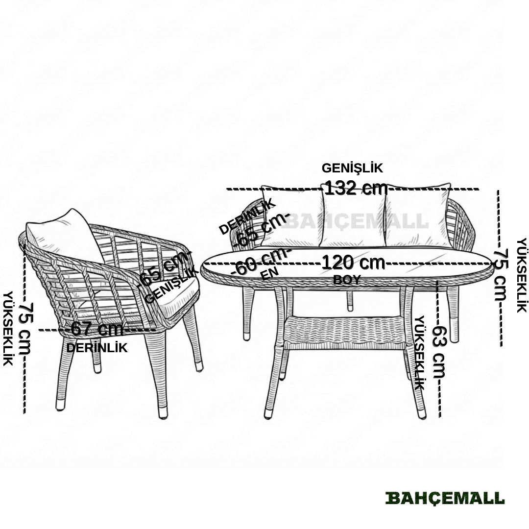 • 2'li Koltuk: Genişlik 132 x Derinlik 65 x Yükseklik 75 cm