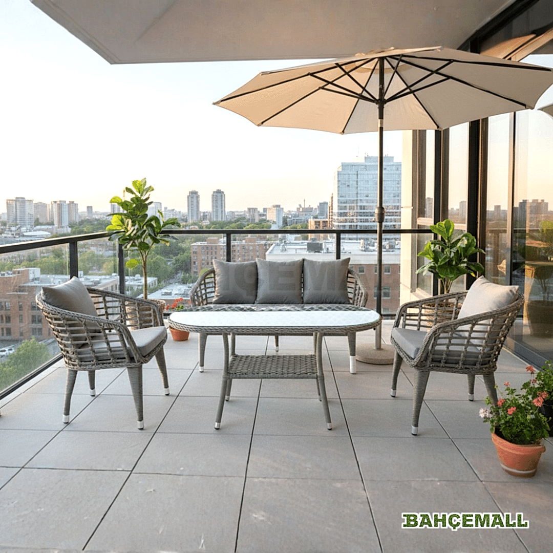 • Bu Happy Bahçe Mobilyası, bir adet Sehpa ve iki adet Tekli ve bir adet İkili koltuktan oluşur.