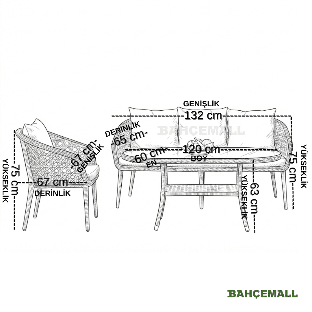 • 2'li Koltuk: Genişlik 132 x Derinlik 65 x Yükseklik 75 cm