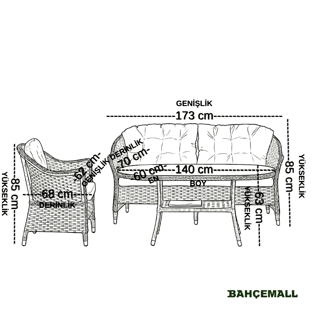 - 3'lü Koltuk: Genişlik 173 x Derinlik 68 x Yükseklik 85 cm
