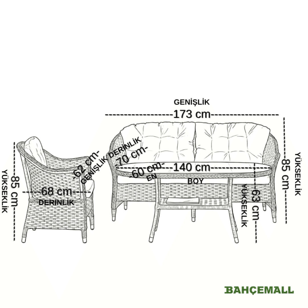 • 3'lü Koltuk: Genişlik 173 x Derinlik 68 x Yükseklik 85 cm