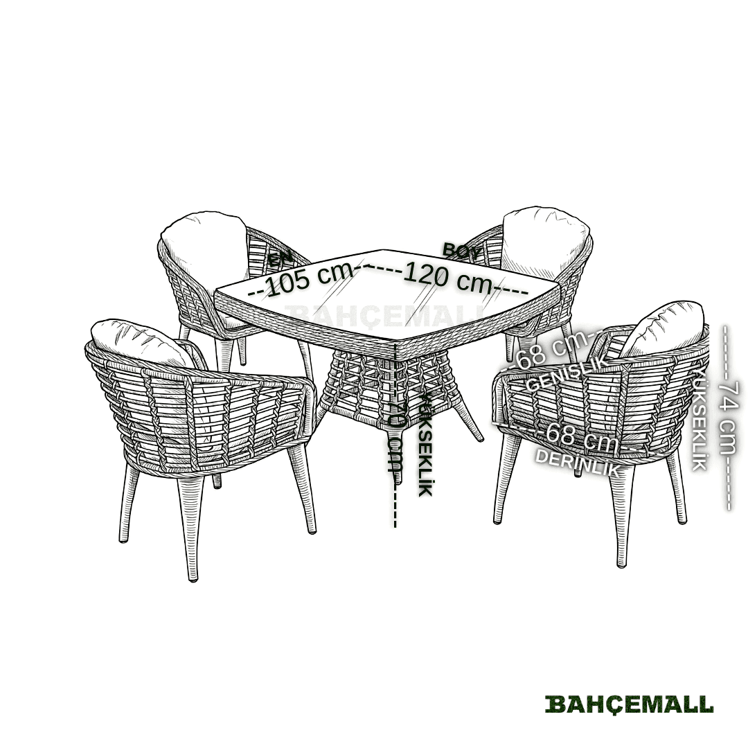 - Bu Efes Bahçe Mobilyası, bir adet Masa ve dört adet Tekli koltuktan oluşur.